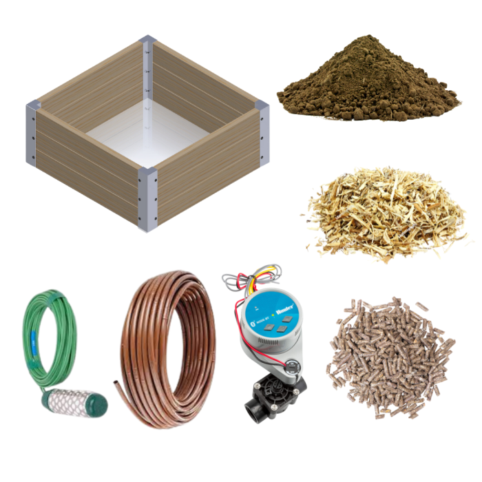 OPTION Réseau d’arrosage goutte à goutte : apporte l´eau directement au pied des légumes réduisant ainsi considérablement les pertes par evaporation. Fourni : tuyaux goutte-à-goutte avec goutteurs intégrés, , raccords et agrafes de maintient.