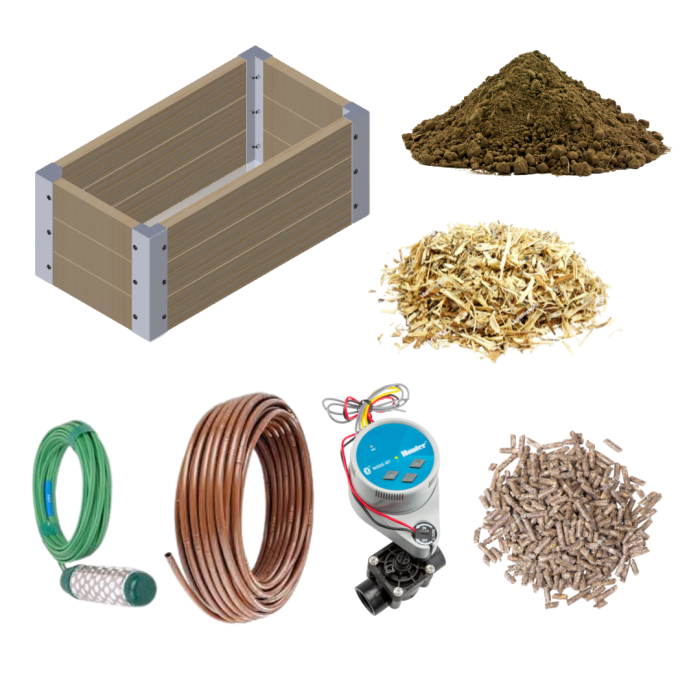 OPTION Paillage naturel : réduit les besoins de désherbage et maintient le sol humide plus longtemps, faisant ainsi diminuer les besoins en arrosage du potager. Favorise la vie des microorganismes bénéfiques du sol, et contribue à la formation d'humus. Fourni : paillage de chanvre/miscanthus utilisable en agriculture biologique.