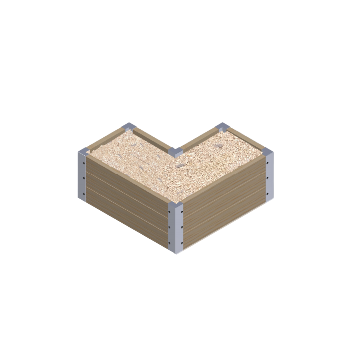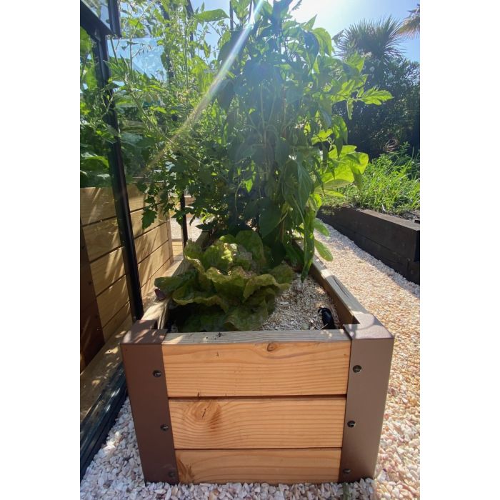 - Bacs en lames de pin douglas (classe 3 non traité) de 30mm d’épaisseur, pour une hauteur totale de 72cm.